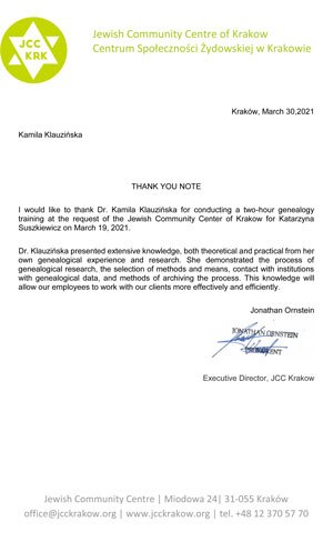 “I would like to thank Dr. Kamila Klauzińska for conducting a two-hour genealogy training at the request of the Jewish Community Center of Krakow for Katarzyna Suszkiewicz on March 19, 2021.